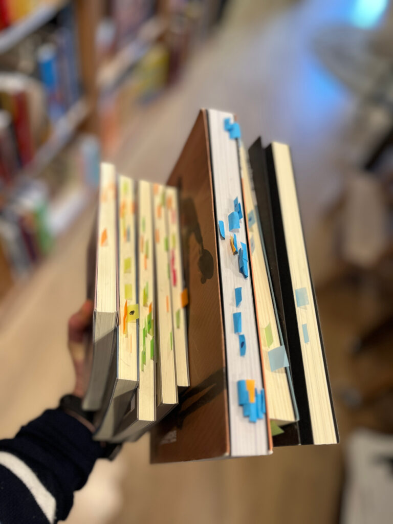 En el tintero para venir a Urueña quedaron otros estupendos autores que han publicado con esta editorial, como Sergi Bellver, al que sigo y admiro desde que leí sus Variaciones sobre Budapest y del que me habló por primera vez Pilar, o Ricardo Martínez Llorca, autor de Eva en los mundos. Escritoras y cronistas, que también llevé, al igual que los de Suso, el de Mario, Egeria y algún otro de La línea, a mi sección de libros y música en Entre dos luces, de RNE. Los marcadores de colores que veis en algunos de ellos señalan toda esa música que encontré entre líneas.