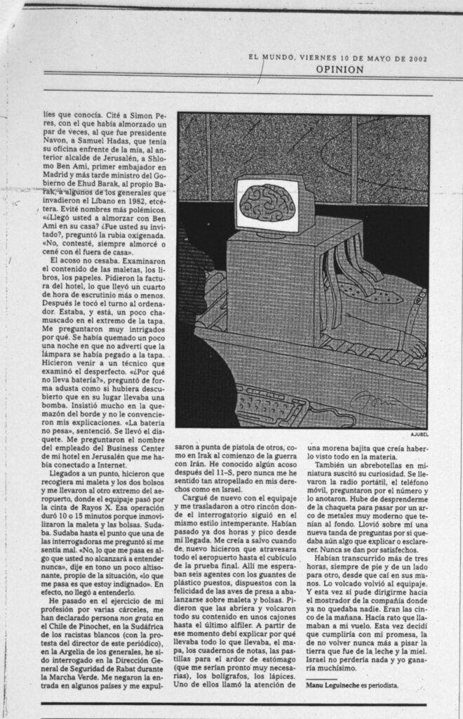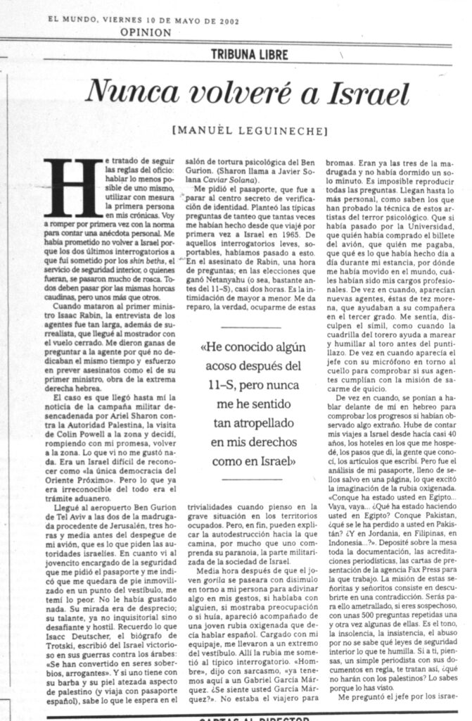 En estos días nefastos, negros, nos acordamos del maestro Manu Leguineche y de este artículo en el que -contra su costumbre de buen periodista de no hablar de sí mismo- publicó en 2002. Aunque no debamos ser protagonistas, a veces, lo que nos pasa a los periodistas en el ejercicio de nuestra labor, es también información valiosa que merece la pena compartir, como en este caso. Por más dificultades que hubiera tenido incluso en regímenes totalitarios, Manu nunca se había sentido «tan atropellado» en sus derechos como en Israel, decía. Fidel Raso, que también sufrió, años antes, en los 90, el desagradable y enervante trato de la policía al llegar como enviado especial a Israel, guardó años después en su archivo este artículo que compartimos por ver en él reflejada la experiencia (y el cabreo) que sintió entonces. Lo de ahora, el asesinato deliberado de periodistas gazatíes (más de 210 desde el 7 de octubre de 2023) y la prohibición de entrada en Gaza de colegas extranjeros, es el dramático epílogo de una política de décadas, lo que ocurre con el genocidio después de más de un siglo de colonización y limpieza étnica en Palestina, que comenzaron antes de 1948. La última vez que fuimos testigos de los abusos de Israel -para mi era la primera-, fue en Cisjordania hace casi siete años. No, no volvemos a Israel, maestro.