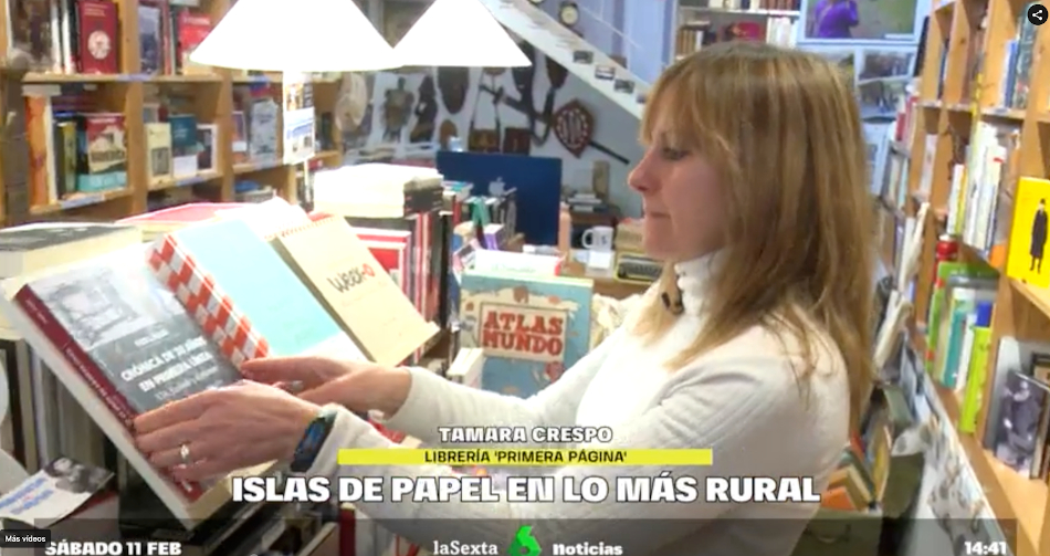 «Así resisten las librerías de la España vaciada que no temen al lobo feroz de las grandes multinacionales. Plantan cara a las grandes multinacionales en lugares recónditos de la llamada España Vaciada: son las librerías rurales y de proximidad enclavadas en pequeños pueblos y aldeas que surten de lecturas a sus vecinos.» Este era el comienzo del texto de Rubén Montes, de los informativos de fin de semana de La Sexta, una información emitida el 11 de febrero. En el reportaje se relataba la experiencia de tres libreras rurales: Paula Vázquez, de la aldea de Proendos, Lugo, y dos vallisoletanas, Cristina Pérez, de la Librería la Leona, de San Miguel del Arroyo y Tamara Crespo, de la librería Primera página, en Urueña.